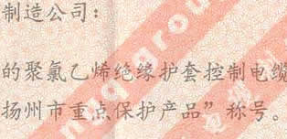 揚(yáng)州市重點(diǎn)保護(hù)產(chǎn)品稱號(hào)證書(聚氯乙烯絕緣護(hù)套電纜產(chǎn)品)