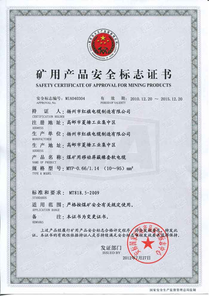 煤礦礦用產(chǎn)品安全標(biāo)志證書(shū)-MYP-0.66(1.14)